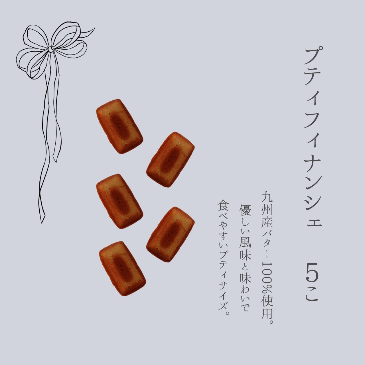 フィナンシェは九州産バター100%使用、優しい風味と味わいで食べやすいプティサイズ。